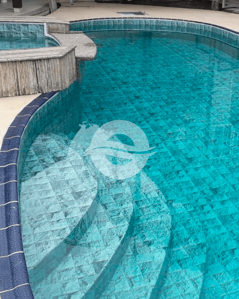 A estampa Indonésia traz tons esverdeados inspirados no mar paradisíaco do Sudeste Asiático, criando um visual elegante e refrescante na piscina. Ideal para quem busca sofisticação com um toque natural.